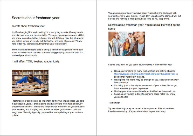 A project to write an SEO-oriented blog on “Secrets of the First Year in College”