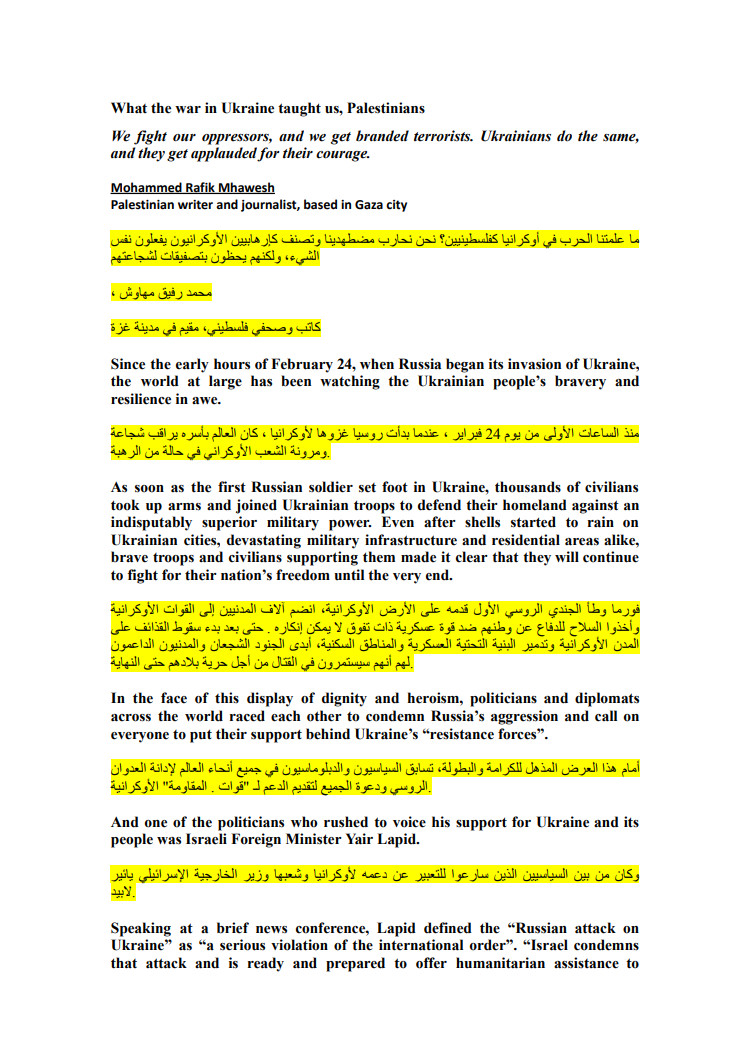A project to translate an article about the war in Ukraine in the context of the Palestinian experience