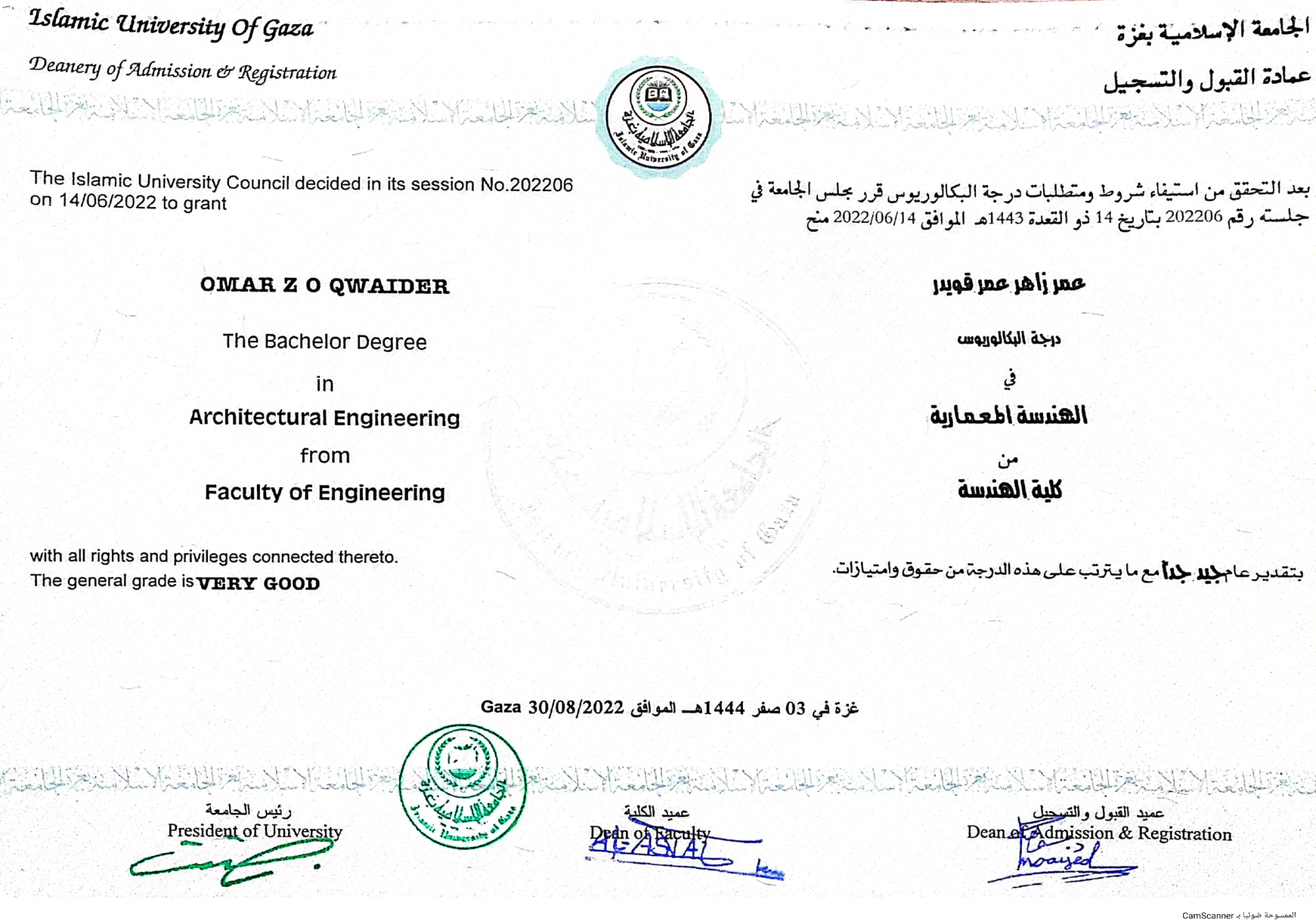 I’m Omar Qwaider, a passionate Architect with a Bachelor's degree in Architecture (2022) and currently pursuing a Master’s degree in Architecture. I specialize in creative, functional, and code-compliant architectural designs for residential, commercial, and mixed-use buildings.