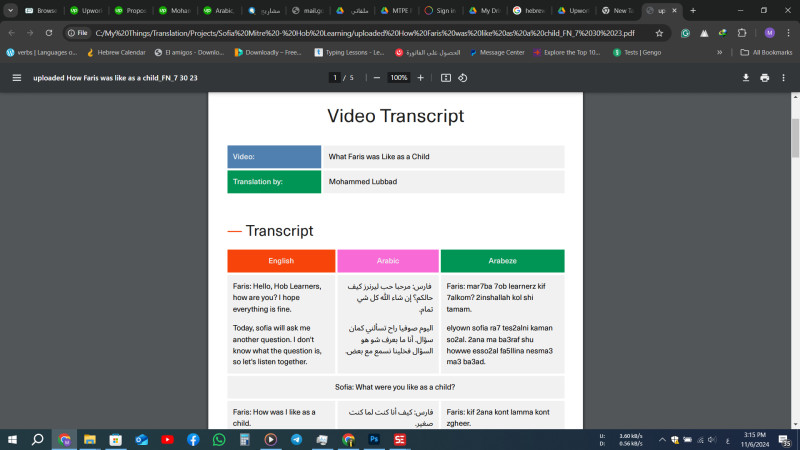 Over the past 5 years, I have completed a wide range of translations, including TV series, scientific web articles, and academic texts, all with excellent client feedback. My expertise spans both formal and colloquial Arabic, enabling me to deliver translations that are accurate, natural, and tailored to the context—whether for academic, professional, or everyday use.