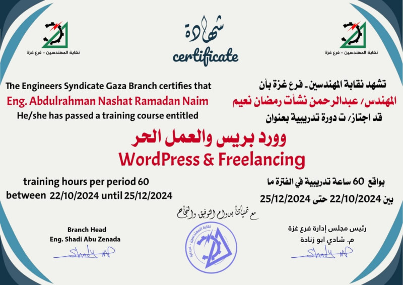أعمل على تصميم وتطوير مواقع إلكترونية باستخدام ووردبريس، مع خبرة في تخصيص القوالب، تطوير الإضافات، وتحسين الأداء وتجربة المستخدم. أقدّم حلولاً احترافية تلبي احتياجات العملاء وتضمن سرعة، أمان، وسهولة إدارة المحتوى. سواء كنت تبحث عن موقع تعريفي، مدونة، متجر إلكتروني، أو موقع مخصص، يمكنني مساعدتك في تنفيذ رؤيتك بأفضل صورة.