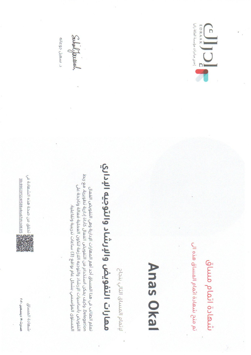| Delegation, guidance and administrative guidance skills course | Edraak platform affiliated with Queen Rania | Electronic marketing | 2020-12-19 |