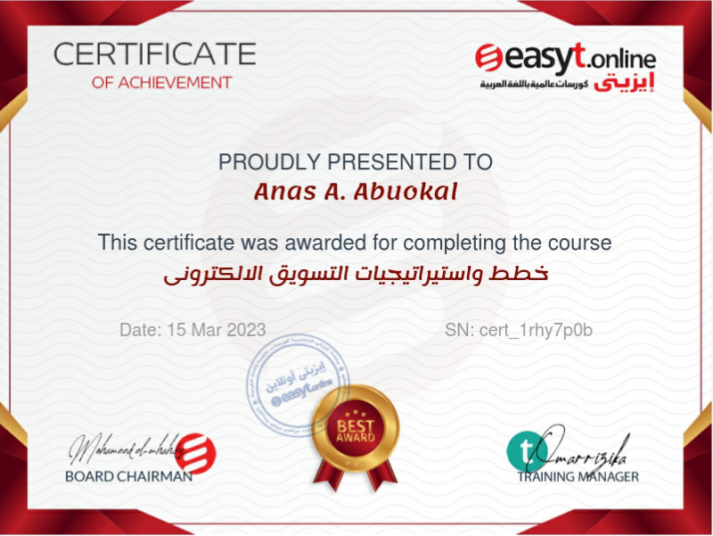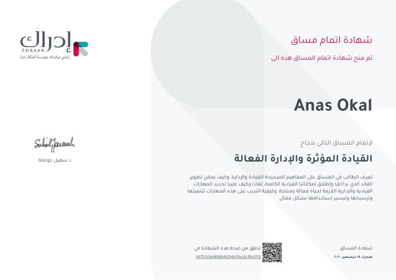| Influential leadership and effective management course | Edraak platform affiliated with Queen Rania | Electronic marketing | 2020-12-18 |