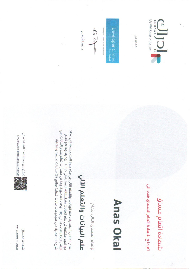 | Data science and machine learning course | Edraak platform affiliated with Queen Rania | Electronic marketing | 2020-12-20 |