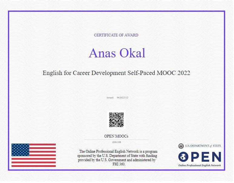 | English for Career Development Self-Paced MOOC course 2022, US Department Of State | US Department of State | Electronic marketing | 2022-12-20 |